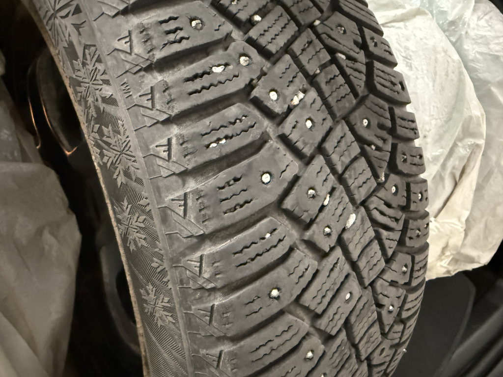 - Kahdet hyvät renkaat, nastalliset Continental talvirenkaat.