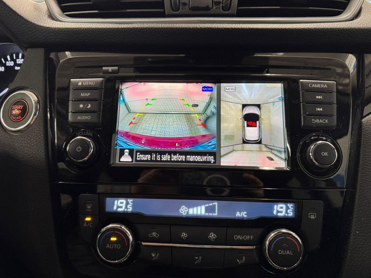 Integroitu NissanConnect-navigointi- ja -audiojärjestelmä (DAB),Around View Monitor -kamerajärjestelmä,Etu- ja takapysäköintitutka,Peruutuskamera,Aktiivinen pidonhallinta,ESP-ajovakaudenhallintajärjestelmä,Automaattinen ilmastointi kaksivyöhykkeisellä säädöllä,Stop/Start -järjestelmä,Etumatkustajan istuimen manuaalinen korkeussäätö,Etumatkustajan istuimen manuaalinen ristiselän tuen säätö,Kaksi ISOFIX-lastenistuimen kiinnityskohtaa takaistuimissa,Kuljettajan istuimen korkeussäätö,Kuljettajan istuimen manuaalinen ristiselän tuen säätö,Lämmitettävät etuistuimet,Premium-istuimet kangasverhoilulla,Suhteessa 60:40 jaettu taittuva takaistuin,Takana keskellä kyynärnoja (ja 2 mukitelinettä),Vakionopeudensäädin ja nopeudenrajoitin,Ajotietokone,sadetunnistin,Sähkötoimiset kauko-ohjattavat etu- ja takaikkunat, kuljettajan ikkunassa impulssikytkin,Takalasin pyyhkimessä tihkutoiminto ja automaattinen pyyhintä peruutettaessa,Tummennetut lasit takaikkunassa ja takasivuikkunassa,Tuulilasinpyyhkijät, joissa on ajonopeuden mukaan säätyvä tihkutoiminto,6 turvatyynyä (kuljettajan, etumatkustajan ja sivuturvatyynyt sekä ikkunaturvaverhot), poiskytkettävä etumatkustajan turvatyyny,ABS-jarrut, hätäjarrutustehostin ja EBD,Sähköinen käsijarru,Korinväriset peilinkuoret,Lämmitettävät, sähkötoimiset ja automaattisesti taittuvat sivupeilit,Ohjauspyörän kallistus ja teleskooppinen säätö,D-kirjaimen muotoinen nahkaverhoiltu ohjauspyörä ja vaihteenvalitsimen nuppi,Ajoasetuksen valinta (Normal / Sport),Apple CarPlay® Liitäntä,Haineväantenni,Matkapuhelimen hands free -toiminto Bluetooth-yhteyden avulla,MP3-yhteensopiva CD-soitin,USB-liitäntä ja iPod-yhteys,USB-pistokkeet 2. istuinriville,5" värillinen Advanced Drive - Assist Display (ADAD) -näyttö,7" kosketusnäyttö, AM/FM, MP3/AUX/ Bluetooth®,AUX-liitäntä,Yhden levyn AM/FM CD-soitin ja 6 kaiutinta,Takaovien lapsilukot
